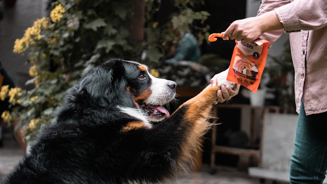 A packet full of little pork flavored dog treats packed with freshly prepared ingredients including freshly prepared meat and offal, such as freshly prepared duck with venison, a source of protein.